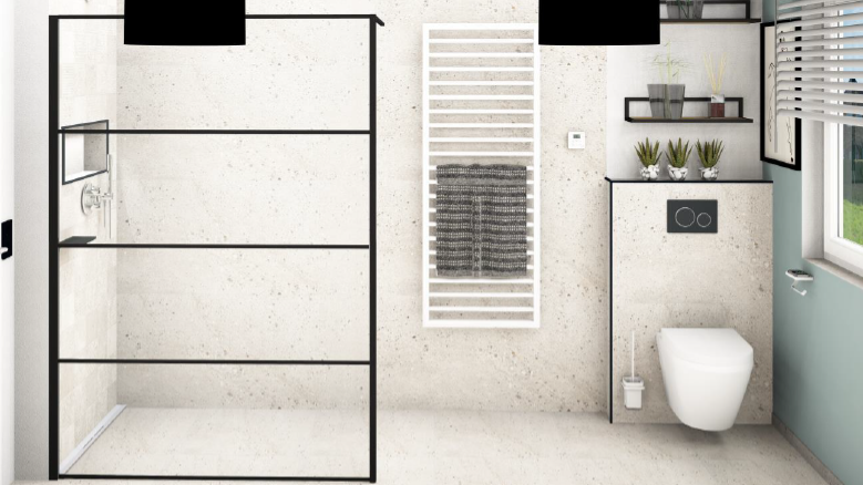 ·         Schwarze Abschlussschienen und Rahmenprofile ziehen sich durch das ganze Bad und verleihen industriellen Look
